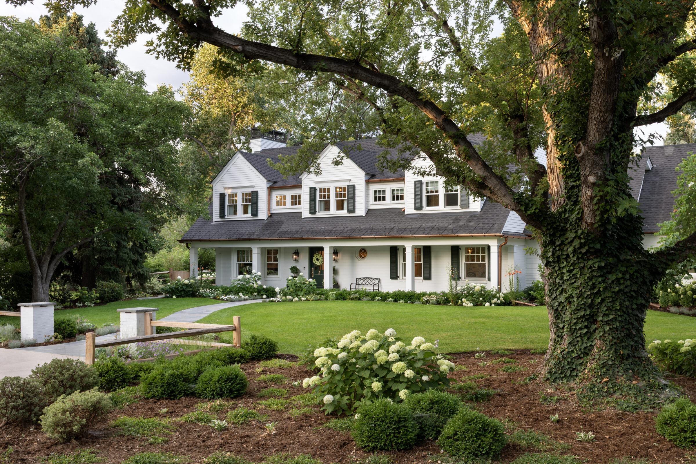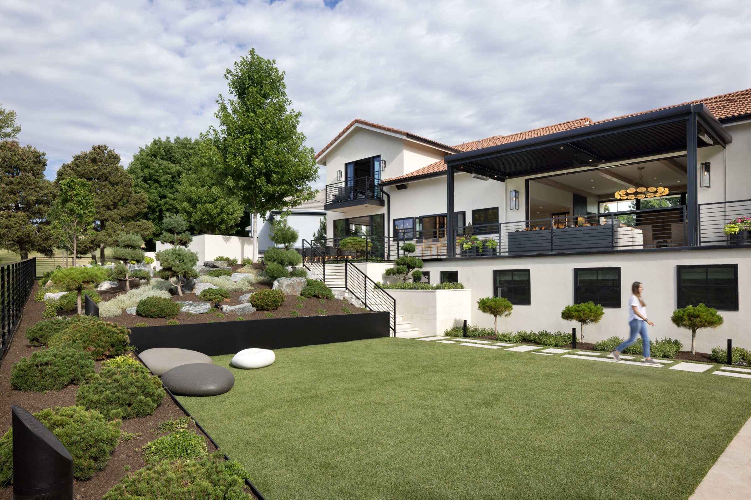A refined estate landscape featuring layered gardens, natural stonework, and elegant outdoor spaces designed to complement the home and its surroundings.