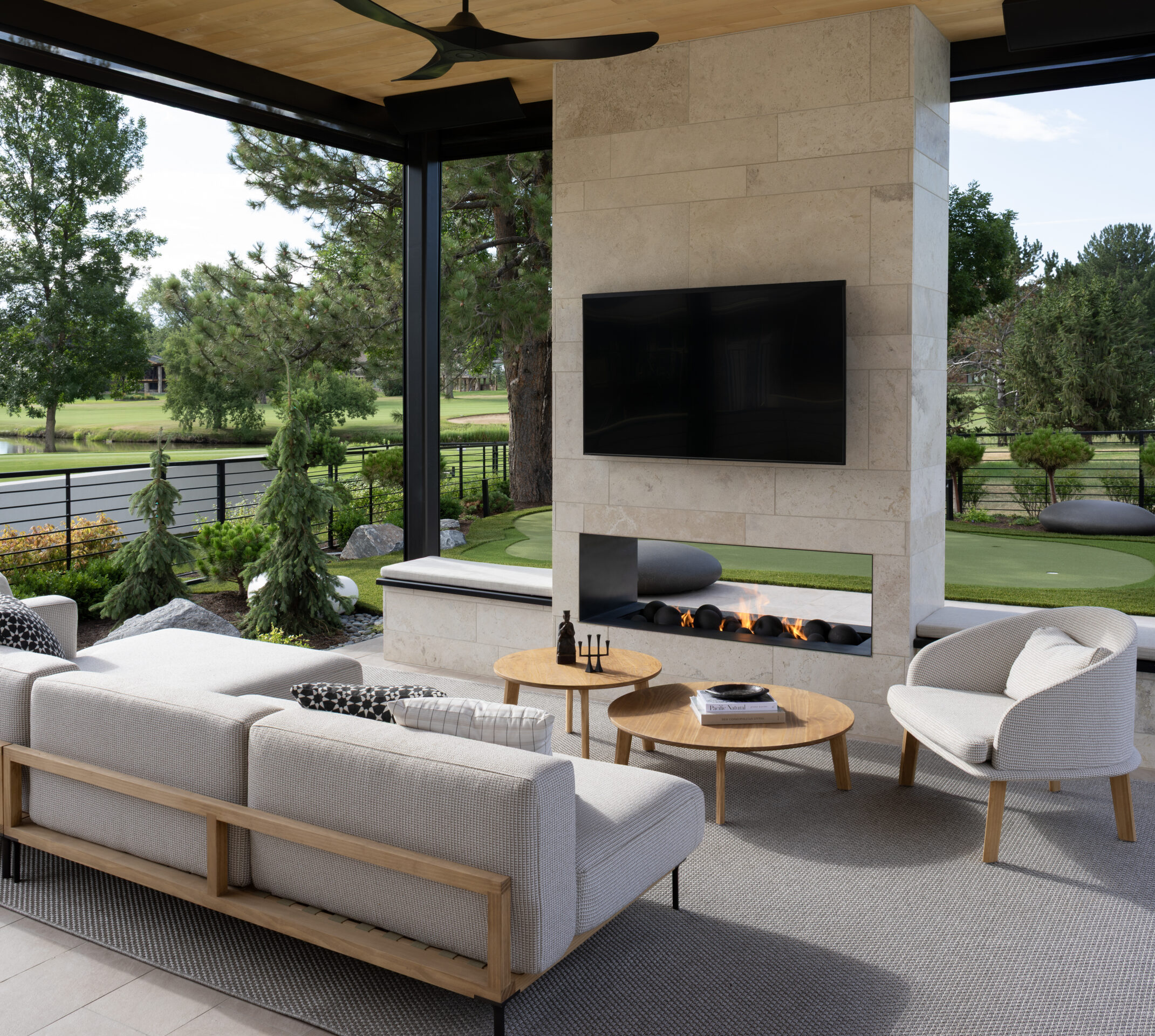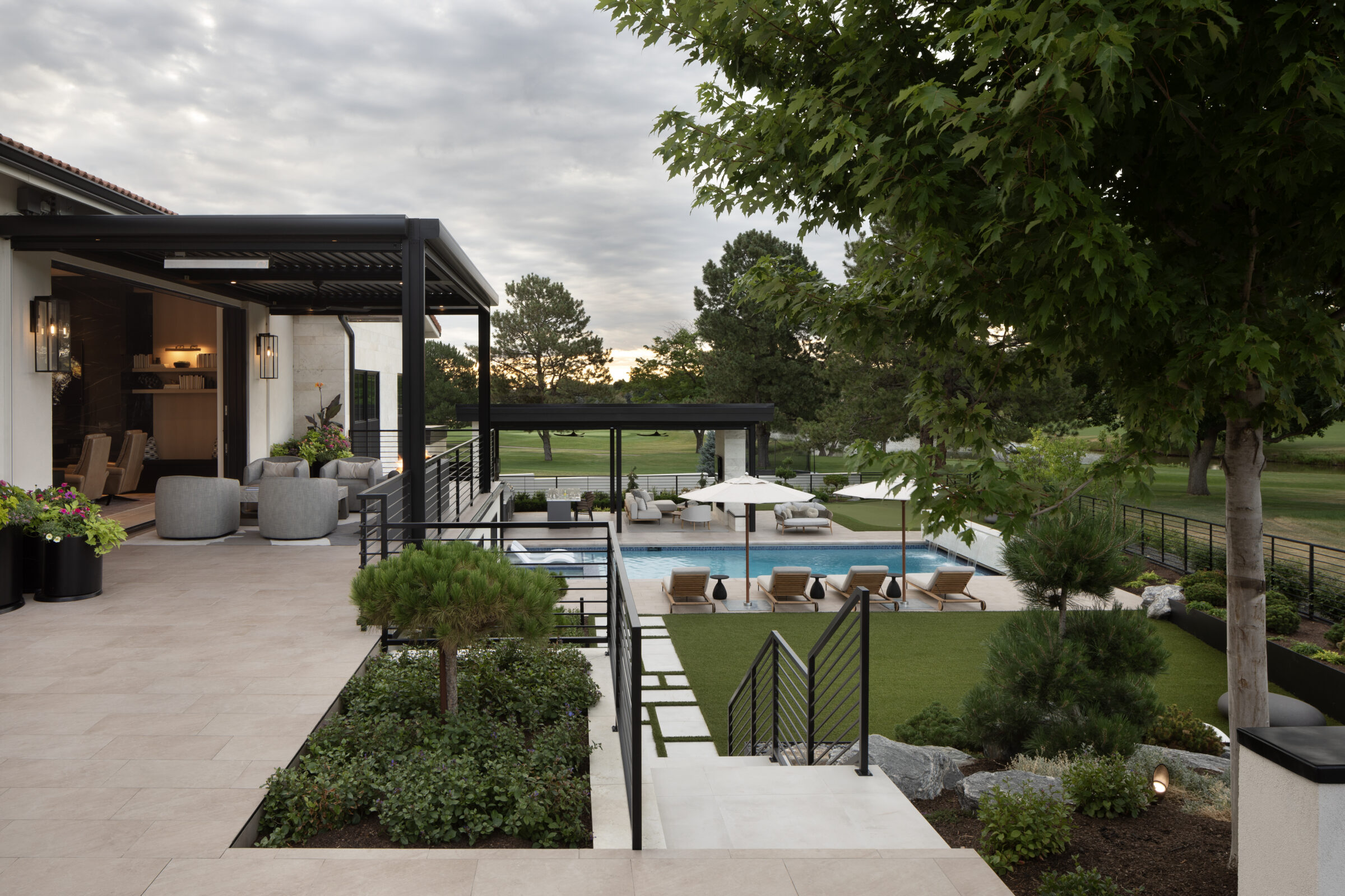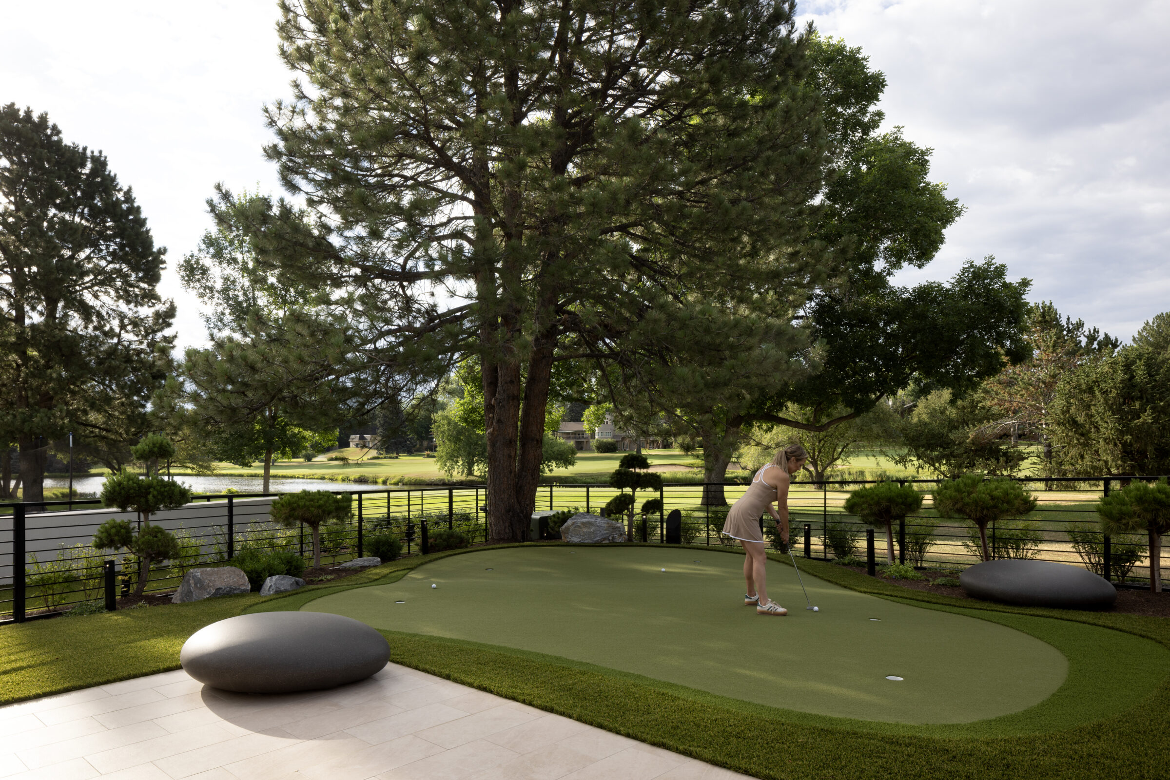 Zen On The Green is a modern landscape designed to create balance, comfort, and connection to its surroundings. Structured terraces, refined plantings, and minimalist materials frame expansive outdoor living spaces, including a pool, lounge areas, and a custom putting green. Thoughtful transitions between interior and exterior spaces allow the landscape to function as a natural extension of the home. Every element is carefully composed to support relaxation, entertaining, and uninterrupted views across the green.