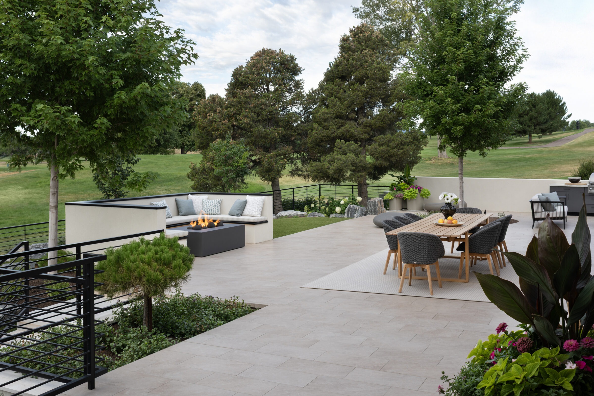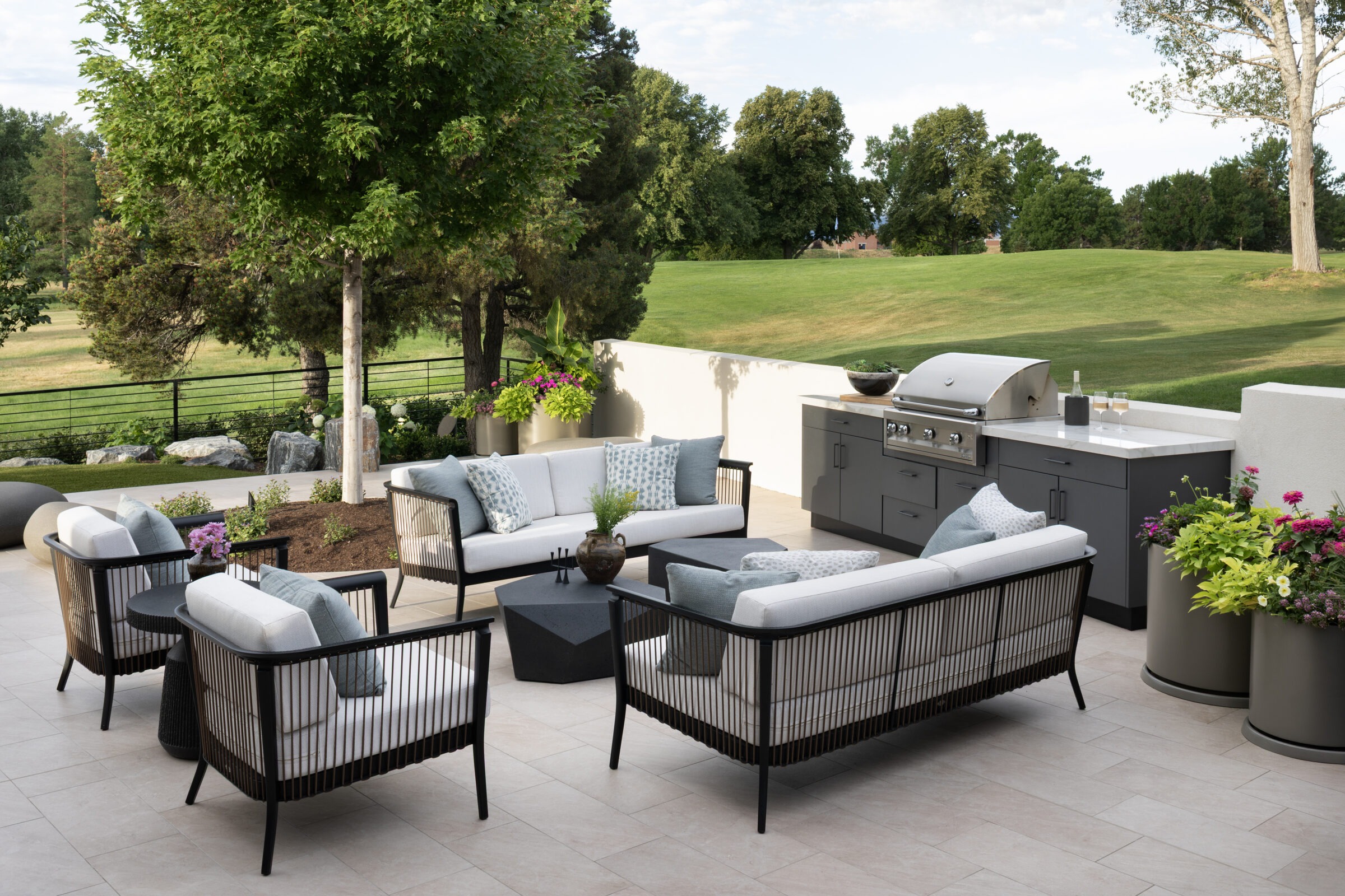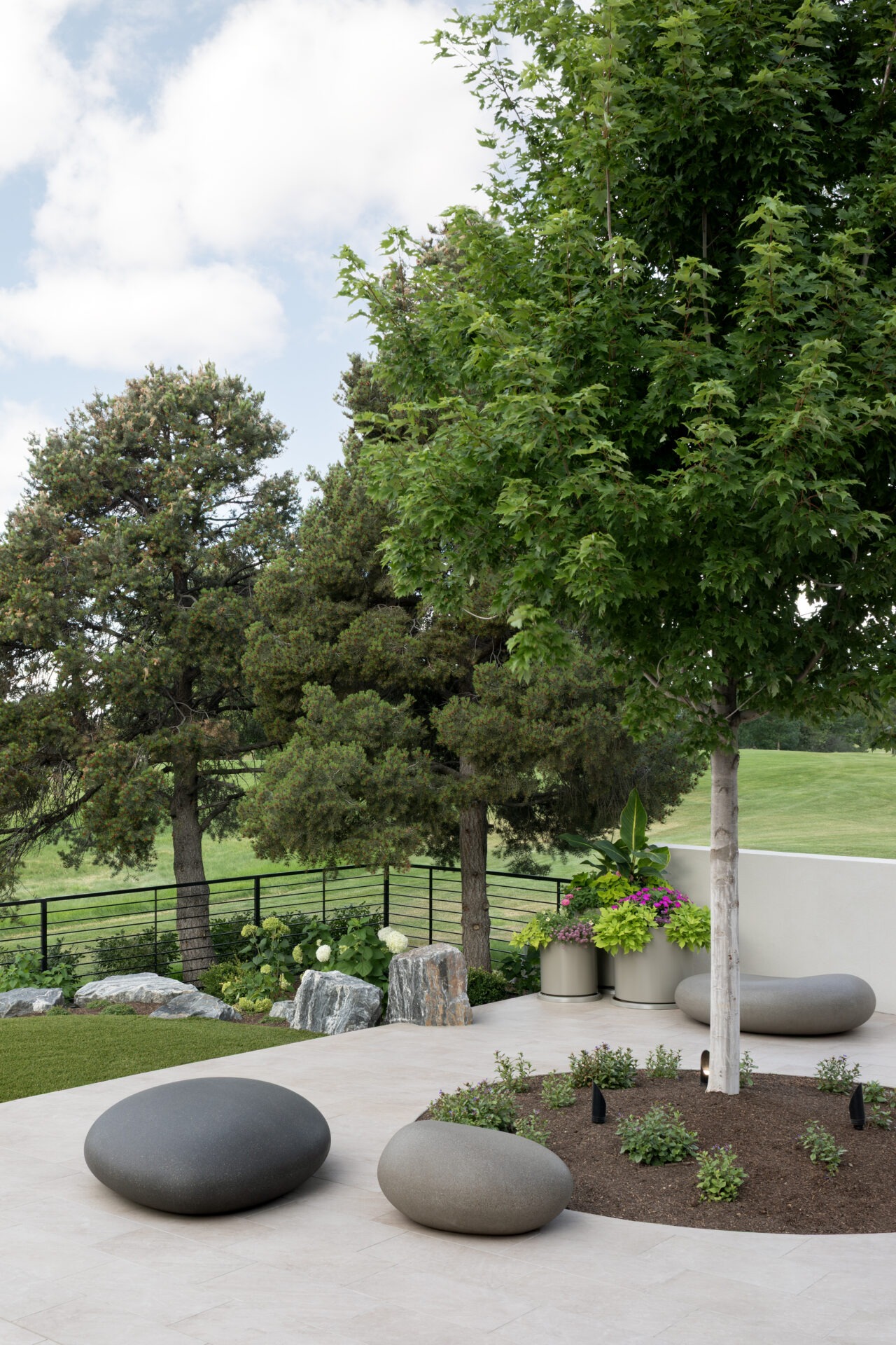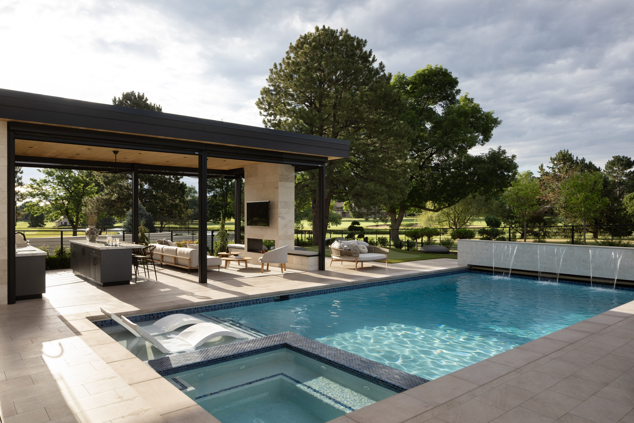 Zen On The Green is a modern landscape designed to create balance, comfort, and connection to its surroundings. Structured terraces, refined plantings, and minimalist materials frame expansive outdoor living spaces, including a pool, lounge areas, and a custom putting green. Thoughtful transitions between interior and exterior spaces allow the landscape to function as a natural extension of the home. Every element is carefully composed to support relaxation, entertaining, and uninterrupted views across the green.